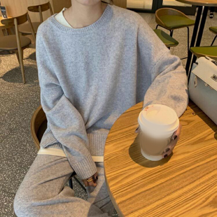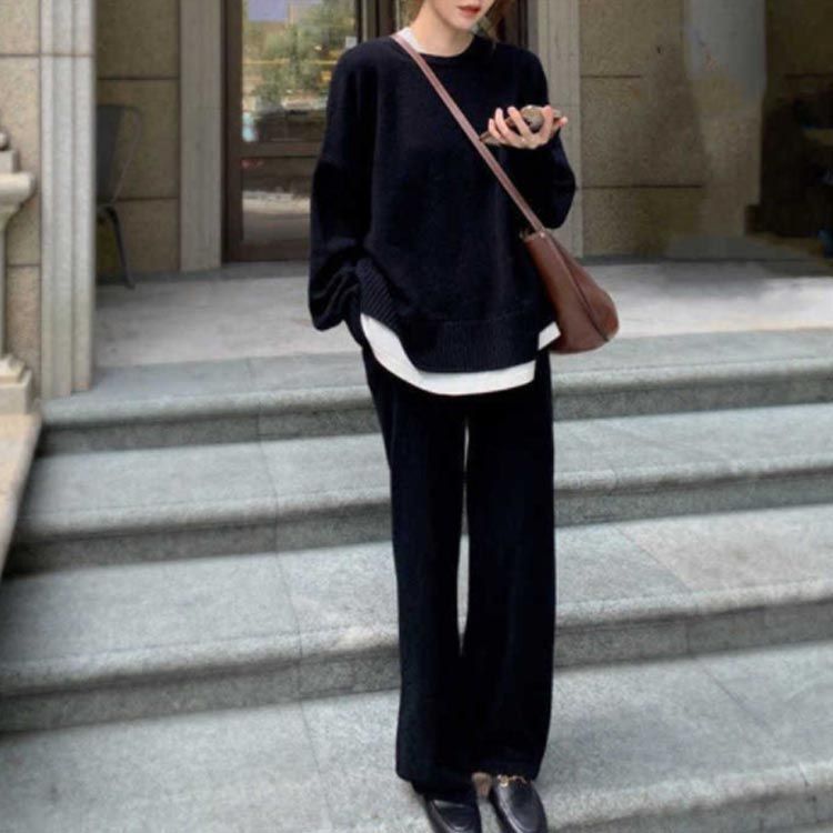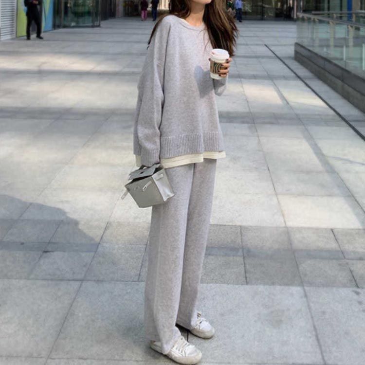 重ね着風 ニット セットアップ パンツ レディースファッション 通販 ピンク ブラック アイボリー グレー ベージュ