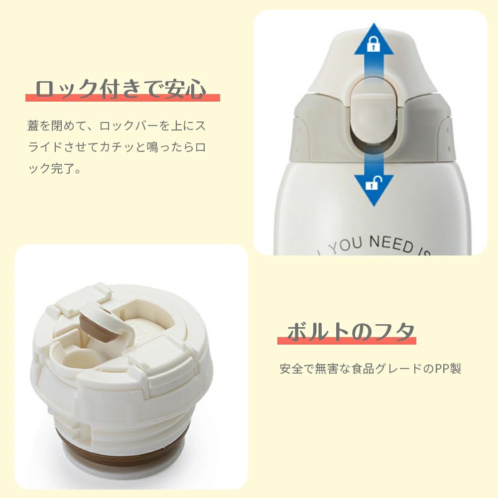 【スプレープルーフ設計】蓋を開けた時も瓶の水で体に吹き付けられる心配はありません。お湯が入っていても、やけどの心配はありません。高い位置で瓶が落ちたときに水が溢れるのを防ぐこともできます。子供の安全がよく保障されています。