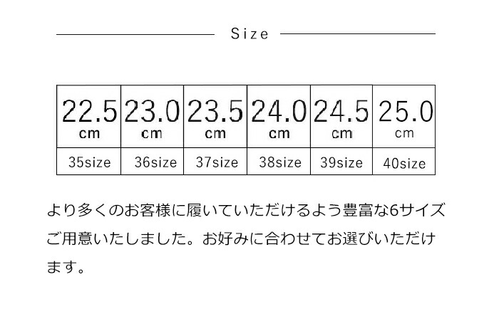 より多くのお客様に履いていただけるよう豊富な7サイズご用意いたしました。お好みに合わせてお選びいただけます。
