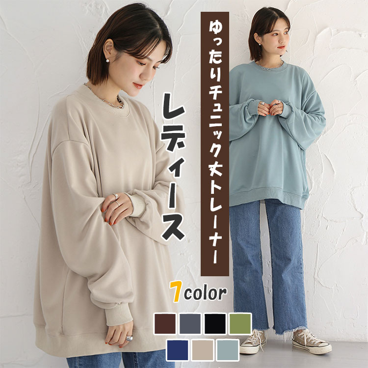 【 送料無料 】 チュニックトレーナー お尻丈 ヒップカバー 女性 ゆったりサイズ 体型カバー 細見せ ラウンドネック 袖リブ 裾リブ リラックス 旅行 お泊り ルームウエア