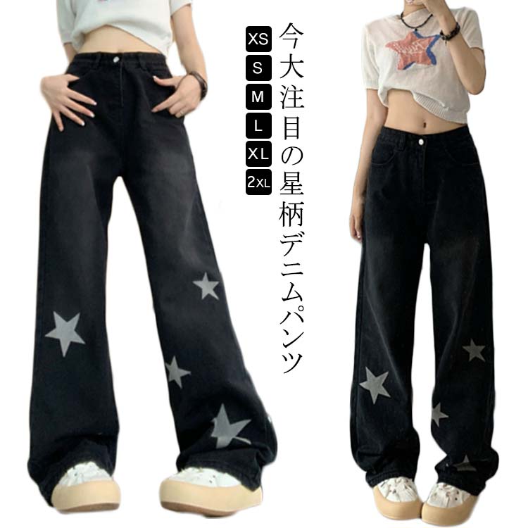 ワイドパンツ デニム ハイウエスト デニムパンツ 星柄 レディース ストレート ジーンズ ボトムス 春秋 きれいめパンツ 美脚 大きいサイズ 脚長効果 着痩せ ゆったり ロングパンツ カジュ おしゃれ