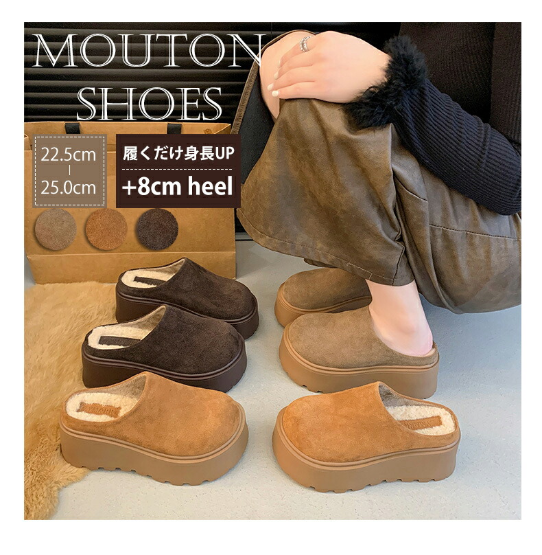 ムートンスリッパ レディース ムートンシューズ スリッパ 厚底 サボサンダル クロッグサンダル 厚底スリッポン スエード 裏ボア 裏起毛 8cmヒール かかとなし もこもこ 防寒 暖かい 歩きや 美脚
