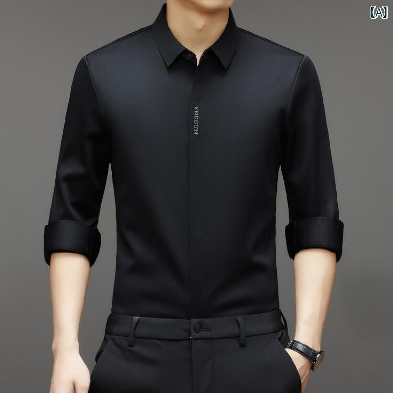 シャツ 男性用 長袖 裏起毛 厚手 無地 ポリエステル シームレス ストレッチ 隠しボタン 比翼仕立て ワイドカラー 大きいサイズ 洗える 秋冬 ゆったり