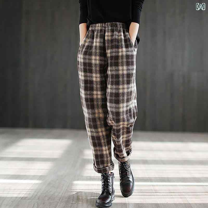パンツ レディース 裏起毛 ウール調 チェック柄 肉厚 ハイウエスト ゆったり ワイド 防寒 暖か 秋冬 通勤 オフィス デイリーユース 着痩せ