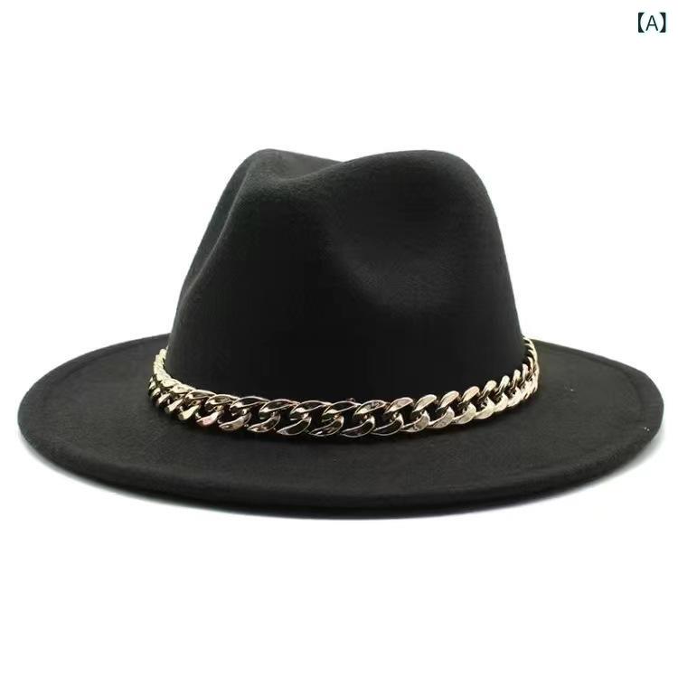 ハット メンズ レディース 秋冬 ウール調 フェルト ジャズハット つば広 平つば チェーン付き 欧米風 カジュアル ブラック キャメル グレー フォーマル