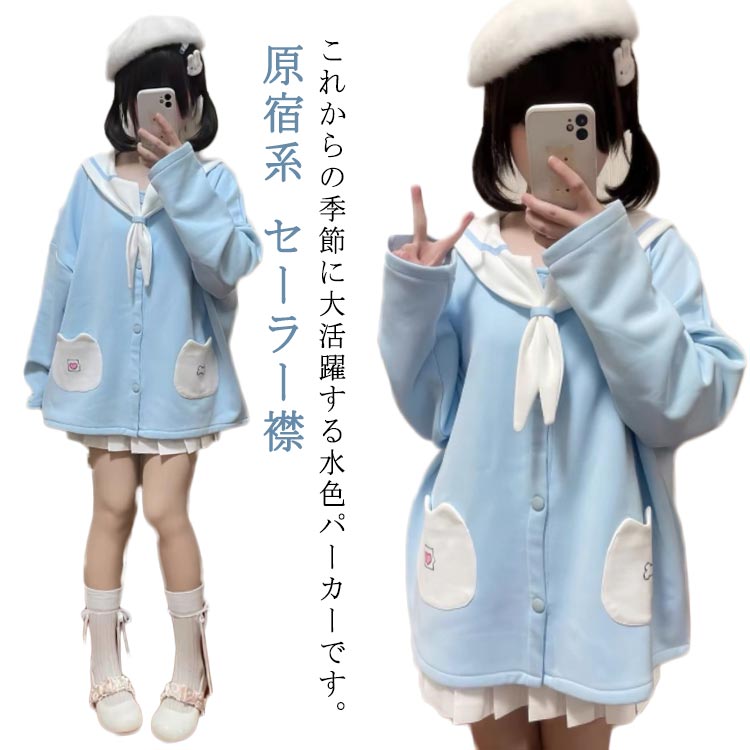 パーカー レディース 服 おしゃれ 長袖 春 秋 冬 トップス セーラー襟 スウェット サブカル系 コート アウター ファッション 水色系統