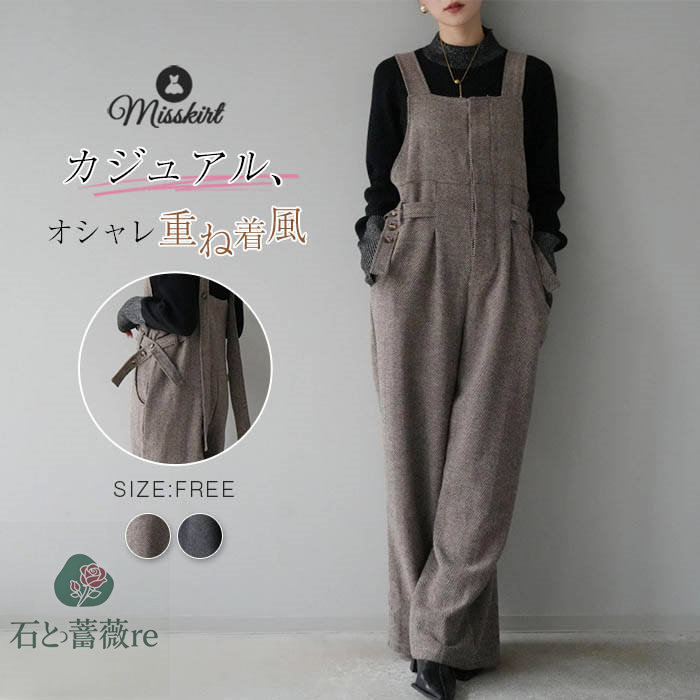 オールインワン パンツ サロペット レディース 新作 無地 ツイード ロングパンツ ノースリーブ デザイン感 春 秋 冬 重ね着 ロング 厚手 体型カバー レイヤード カジュアル エレガント ゆったり