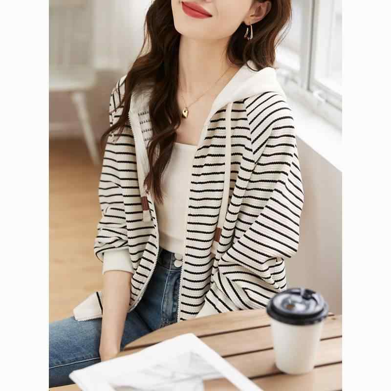 ジャケット レディース パーカー 春秋 カジュアル ストライプ 通勤 フード付き アウター 綿 ミックスカラー スウェット