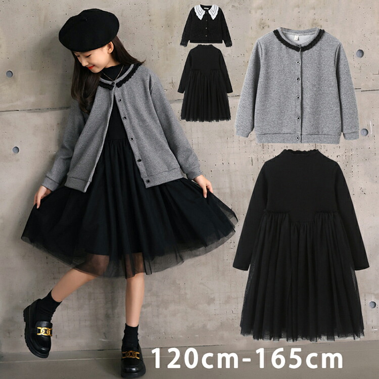 子供服 礼服 2点セット 長袖 ワンピース 黒 フォーマルドレス カーディガン 入学式 入園式 卒業式 卒園式 発表会 結婚式 プルオーバー 子ども服 冠婚葬祭 冬 チュールスカート 女の子 秋