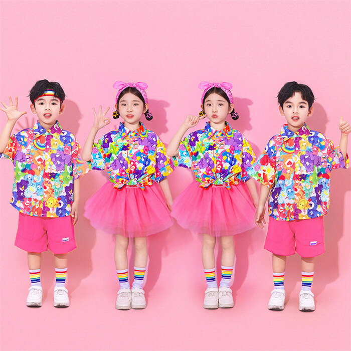 春秋 新品 花柄 シャツ レッド イエロー ブラック ブルー ダンス衣装 ユニセックス hiphop 女の子 男の子 K-pop 舞台 団体服 演出服 キッズ お洒落 ゆったり ス 長袖