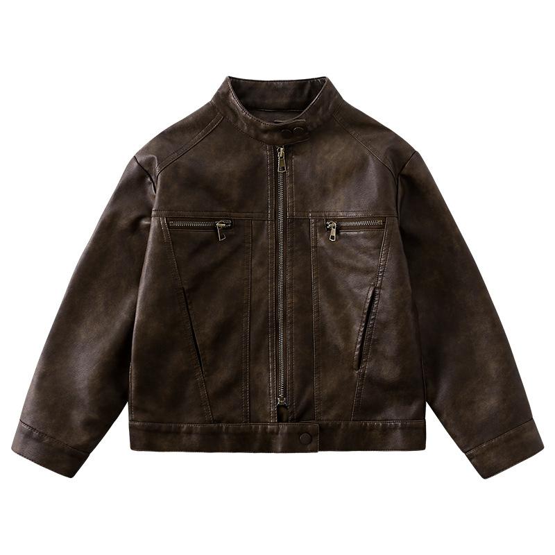 ジャケット 男の子 ボーイズ PUレザー レザージャケット 革ジャン キッズ ジュニア 子供服 アウター ラウンドネック 丸首 ジップアップ ファスナー 無地 韓国ファッション 春秋 ブラ カジュアル
