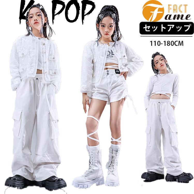スパンコール ジャケット キッズ ダンス 衣装 ホワイト 白 セットアップ ヒップホップ カーゴパンツ へそ出し 白シャツ キラキラ 韓国 韓国風 子供服 ストリート ガ K-POP