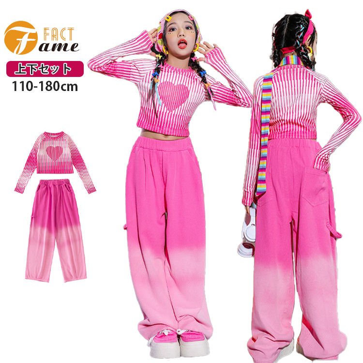 ガールズ ダンス衣装 セットアップ ヒップホップ 長袖 ハート柄 ピンクトップス 長パンツ ヘソ出し 女の子 トップス 肩出し ピンクパンツ チアガール キッズ ダンスウェア ジュニ 演出服