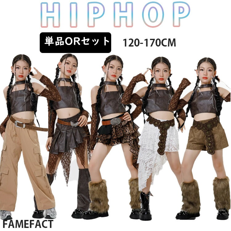 キッズ ダンス衣装 ブラウン トップス レザー ヒョウ柄 スカート 短パン カーゴパンツ へそ出し セットアップ 子供服 ヒップホップ ダンスウェア 女の子 ガールズ 応援団 団体服 イベント 発表会