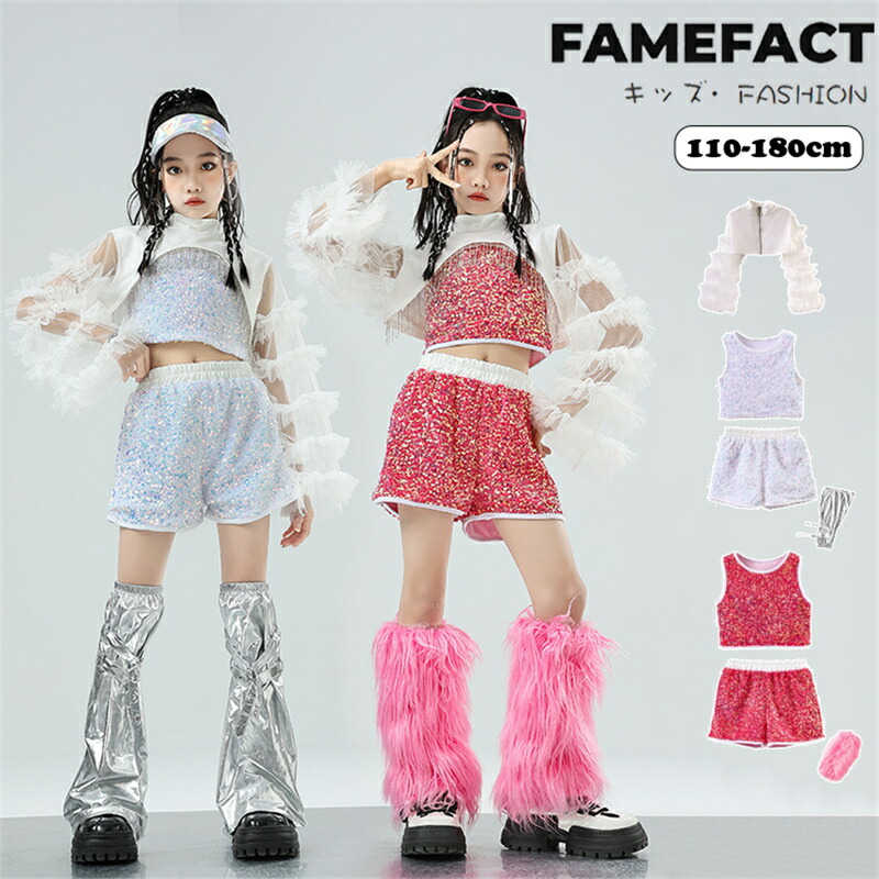 キッズ ダンス衣装 HIPHOP ストリート系 舞台衣装 スパンコール シルバー ピンク 女の子 セットアップ ショートパンツ へそ出し トップス ガールズ キラキラ