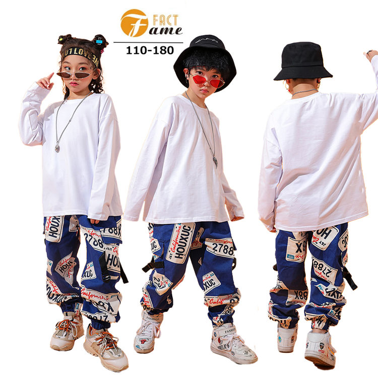 キッズ ダンス衣装 子供服 ヒップホップ パンツ 長ズボン 白シャツ HIPHOP ガールズ ジャッズ 男の子 女の子 ストリート 派手 原宿系 ダンスウェア ゆったり jazz 練習着 団体 体操服