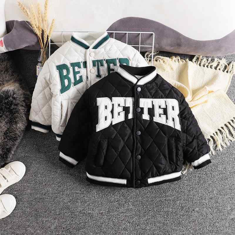 スタジャン ジャケット キッズ ベビー 男の子 女の子 男女兼用 中綿入り 厚手 野球ブルゾン スポーツカジュアル 冬アウター スタンドカラー 長袖 ジップアップ 綿 文字柄 ブラック 暖か コットン