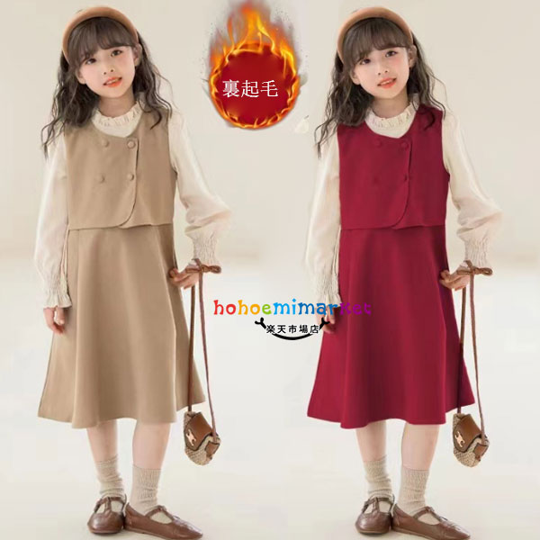 韓国子供服 裏起毛 ワンピース 女の子 フォーマル 発表会 結婚式 冬服 冬着 キッズ お姫様 フェイクレイヤード ページュ レッド 暖かい オシャレ 誕生日 長袖ワンピース