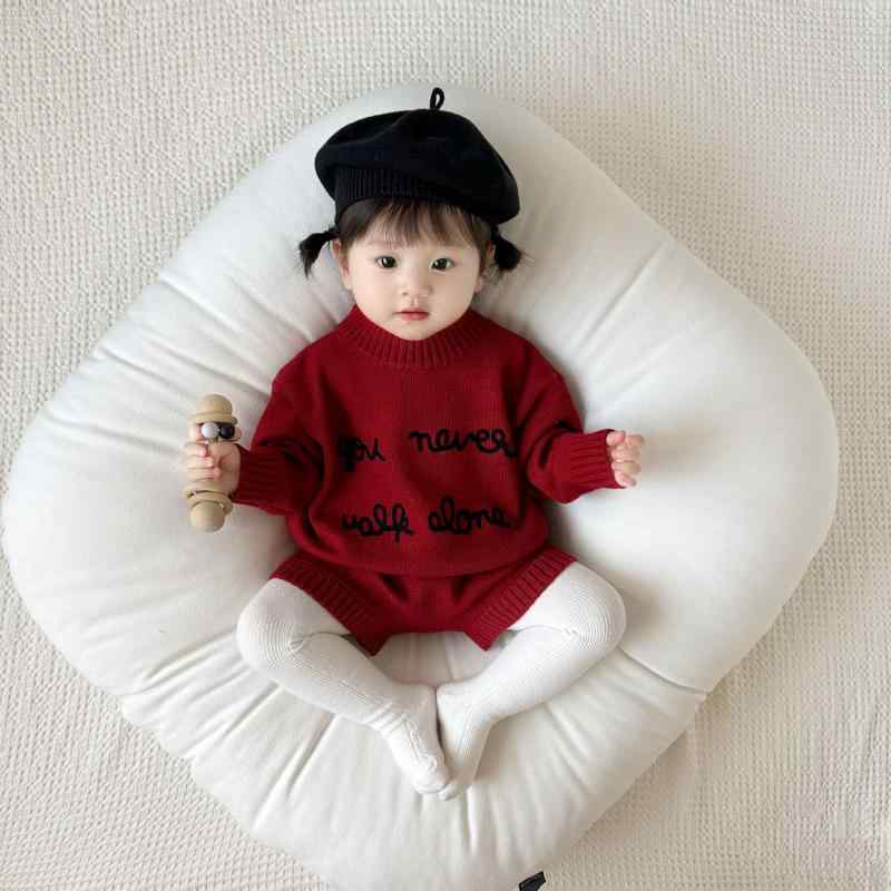ニット ベビー キッズ 秋冬 ニットセットアップ 女の子 丸首 セーター トップス ズボン 2点セット 70 80 90 100 アイボリー 普段着 部屋着 ワインレッド