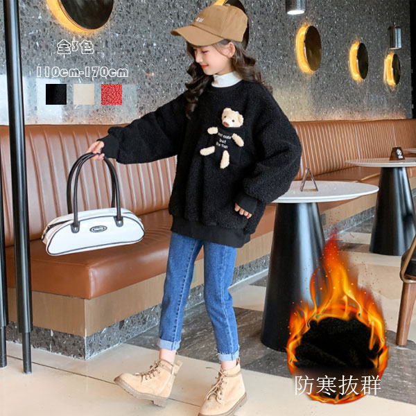 韓国子供服 冬服 可愛い 暖かい パーカー 女の子 防寒 裏起毛 トップス スウェット トレーナー クマ付き キッズ 長袖 丸首 衛衣 冬着 姉妹 お出かけ 通学着 ブラック 双子