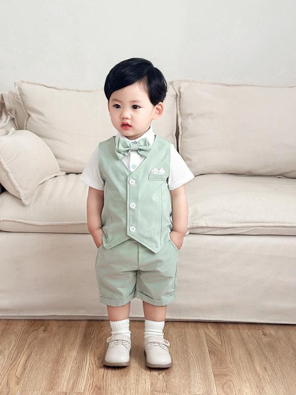 ベビー服 男の子 夏 やわらか 半袖シャツ ショートパンツ ベスト 3点セット フォーマル セレモニー セットアップ お宮参り 結婚式 無地 ポリエステル ライトグリーン 誕生日