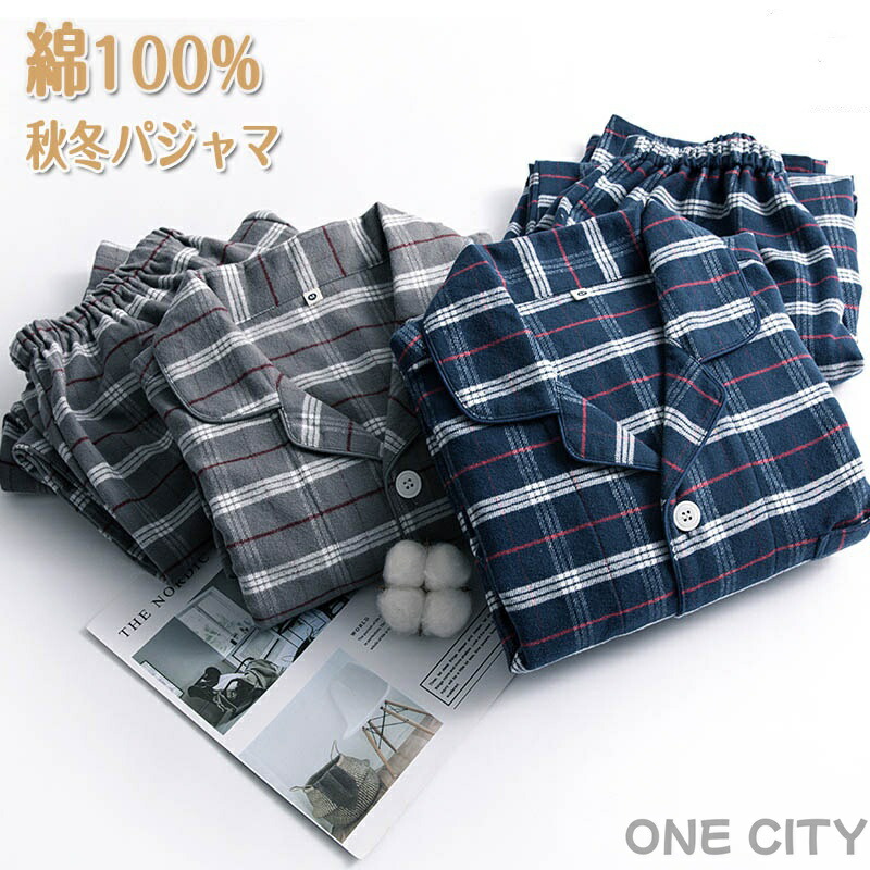 パジャマ メンズ 冬 長袖 起毛 綿100% 前開き 秋冬 コットン チェック柄 ルームウェア 上下セット 秋 秋用 冬用 テーラード襟 紳士 男性 寝間着 寝巻き ギ 部屋着