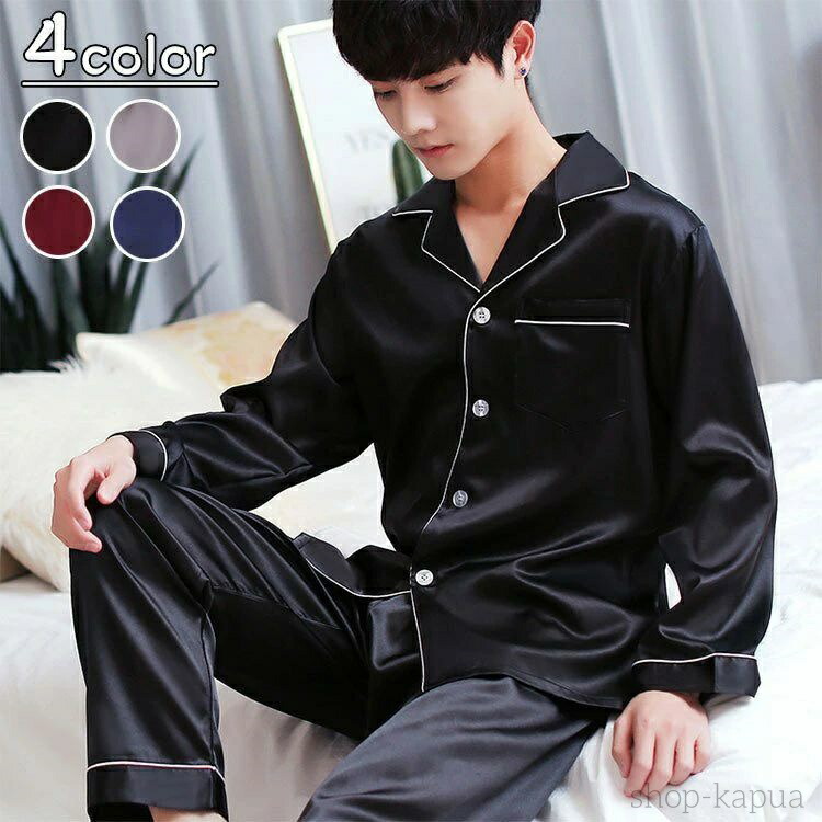 サテン シルク パジャマ メンズ 長袖 上下セット ルームウェア 部屋着 前開き 寝巻き 吸湿性 通気性 肌に優しい 寝間着 着心地良い 静 敏感肌