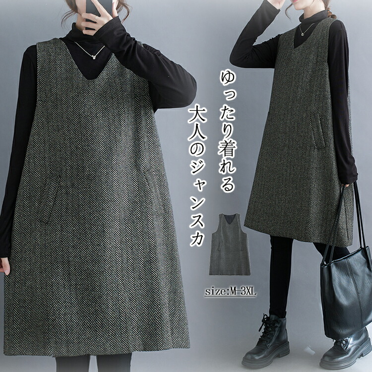 程よいゆったり感が可愛さを実現 ジャンパースカート レディース 秋冬 ワンピース ジャンスカ ノースリーブ ネック 柄