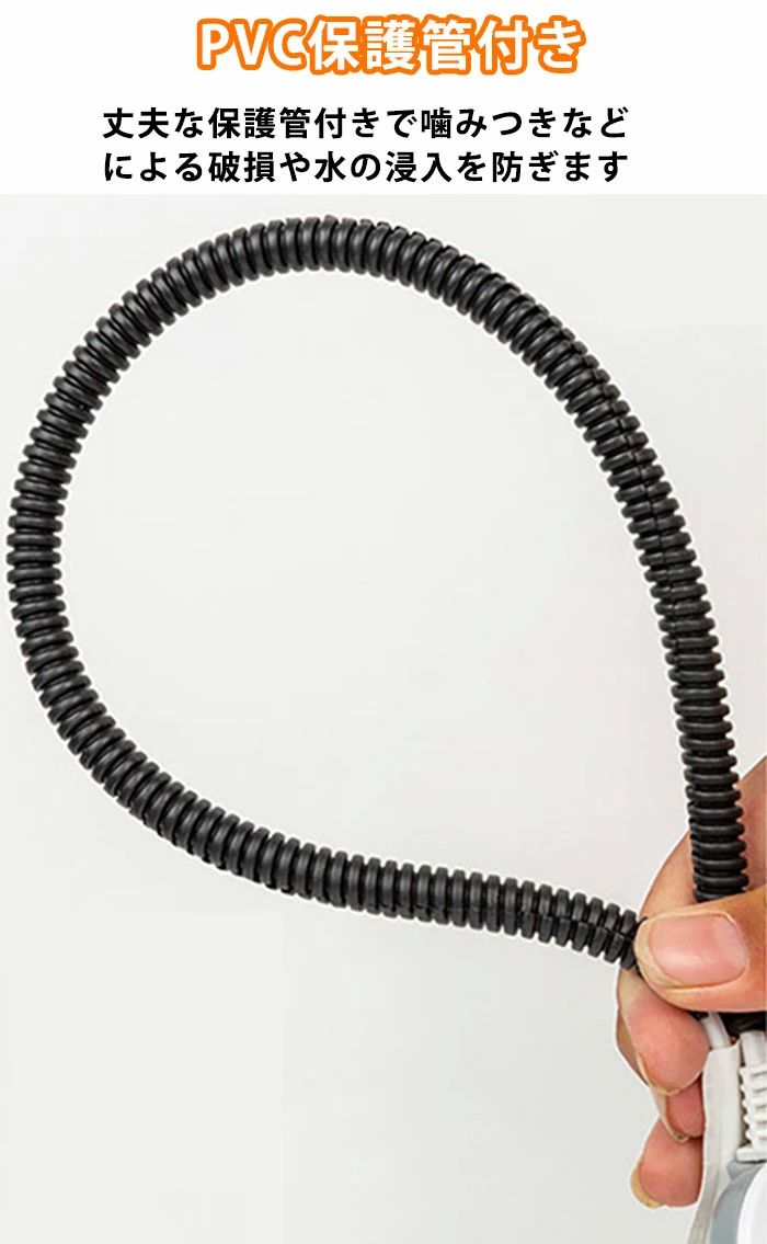 電源コード表面には保護管が付き、犬が電源コードを噛んでも、中のワイヤーが傷む心配がありません。
