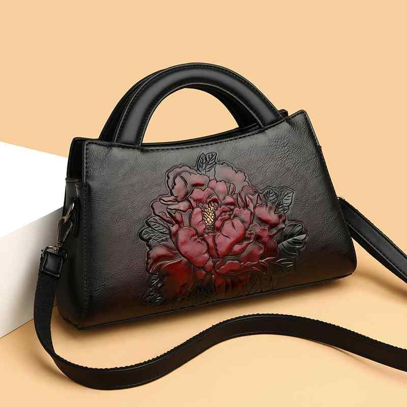 トートバッグ レディース 牡丹柄 レトロ 中国風 肩掛け 斜め掛け PUレザー 型押し 秋冬 普段使い ミディアムサイズ 横型