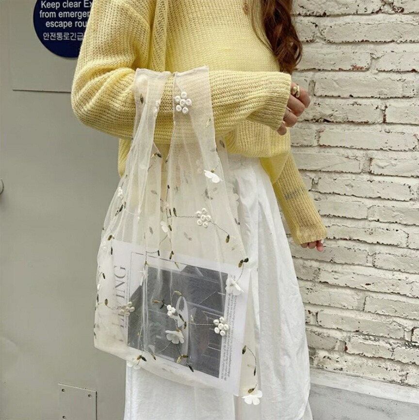 オーガンジーフラワーバッグ メッシュバッグ チュールバッグ ハンドバッグ エコバッグ レディースバッグ おしゃれ 可愛い 透け感