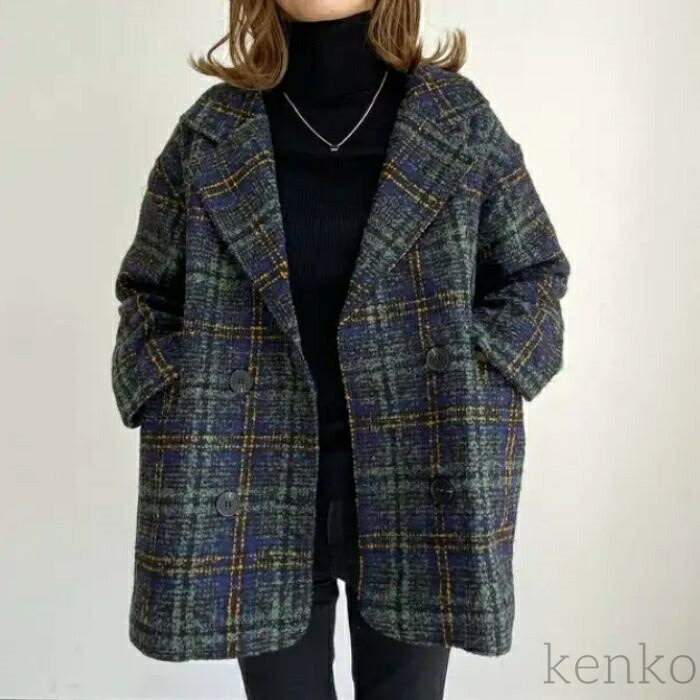 コート レディース 秋冬 ケープ ポンチョ風 カーディガン チェック柄 ウールコート ミドル丈 ゆったり 体型カバー ラウンドネック 五分袖 婦人服 普段使い 湖藍色 ブラック ブラウン 通勤