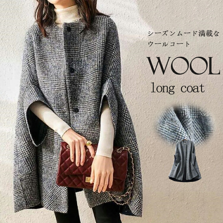 ノーカラーコート ウール ポンチョコート レディース マントコート イギリス風 グレンチェック柄 ドルマンスリーブ ジャケット 長袖 通勤 アウター 防寒着 上着 アウター