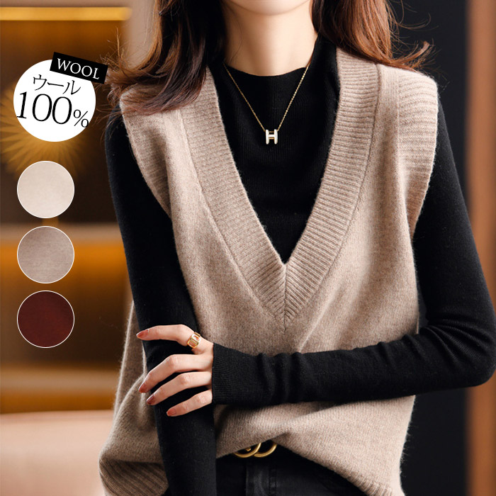 ウール100% ニット ベスト レディース 秋冬 重ね着 レイヤードウールセーター Vネック 無地 プルオーバー ゆったり ノースリーブ ポンチョ 柔らか トレンド 可愛い 通 暖かい