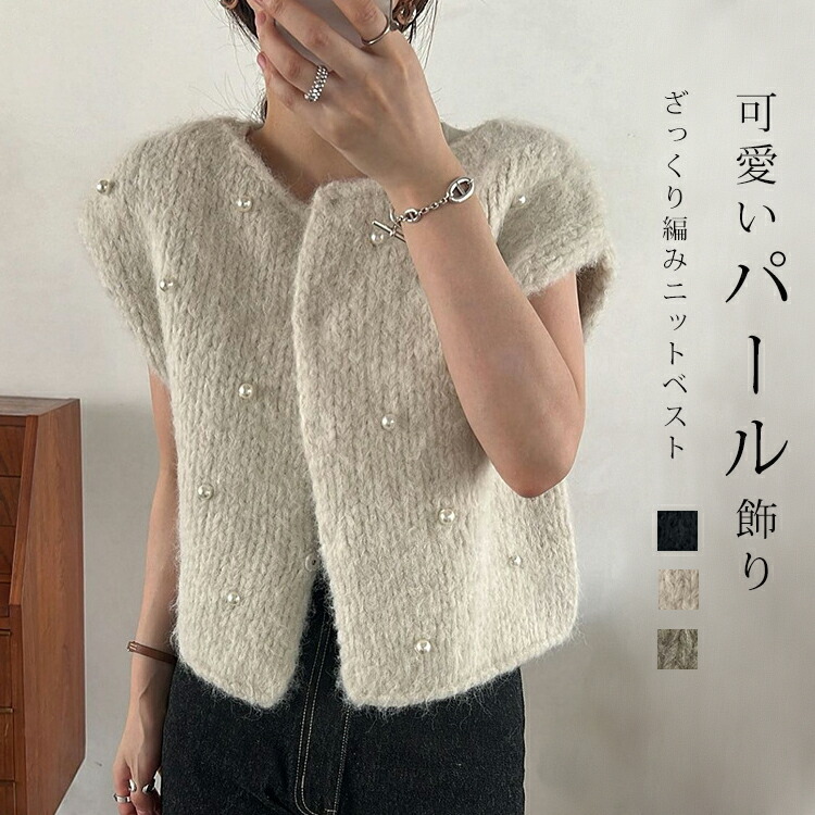 ざっくり ニット ベスト レディース 秋冬 パール飾り ニットベスト フレンチスリーブ クルーネック ショート丈 ジレ チャンキーニット ショート丈ベストパール 可愛い 前開け 編地 フェ ジレベスト