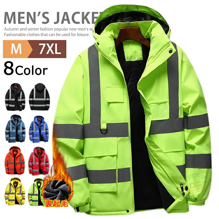 安全服 作業着 作業服 防寒ブルゾン ボアジャケット ウインドブレーカー メンズ 高視認性 警備員 裏起毛 ジャケット マウンテンパーカー ワークジャケット フード付き 反射テープ 大きい カジュアル