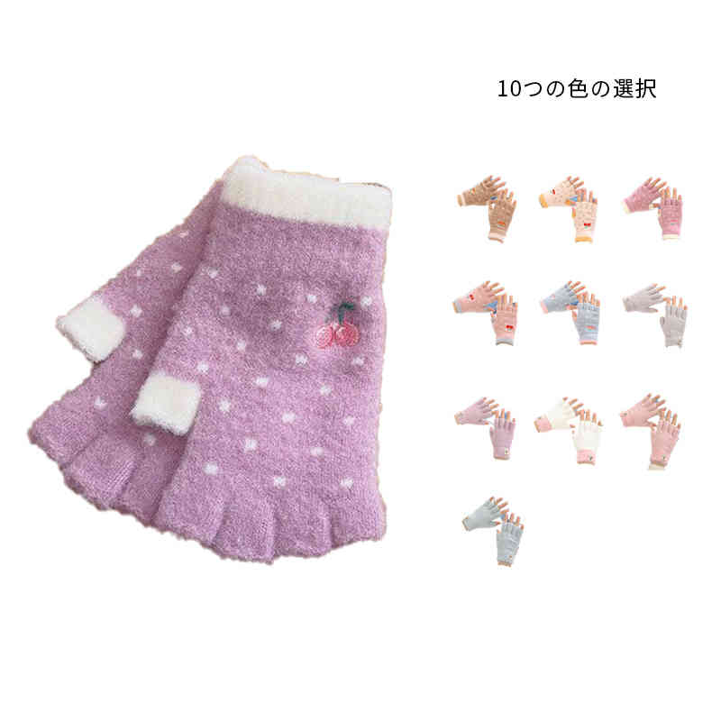 キッズ 手袋 子供 女の子 秋冬 指切り 小学生 指なし手袋 中学生 ニット手袋 子ども用 かわいい おしゃれ手袋 あったか 防寒 通園 通学 子供手袋 切り替え おでかけ アウター 桜桃柄 指なし